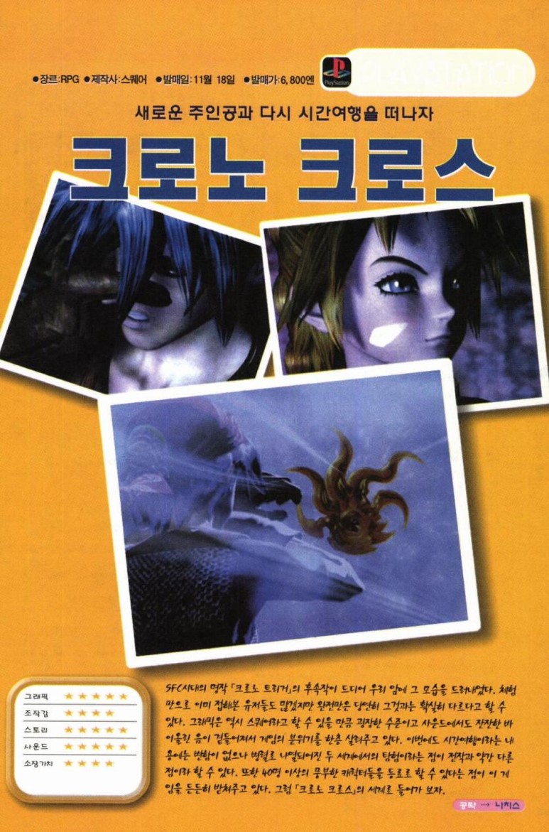 본 게임 크로노 크로스는 크로노 트리거의 후속작이라고는 하지만, 너무나도 보기 싫은 일러스트로 발매 전에는 필자를 비롯한 세간 사람들에게 외면 받았었다. 하지만, 막상 발매된 게임은 FF 시리즈를 필적하는 대단한 퀄리티의 대작! 여러 가지 면에서 무시무시한 완성도를 보여준다. 스퀘어, 네놈의 한계는 도대체 어디까지냐?